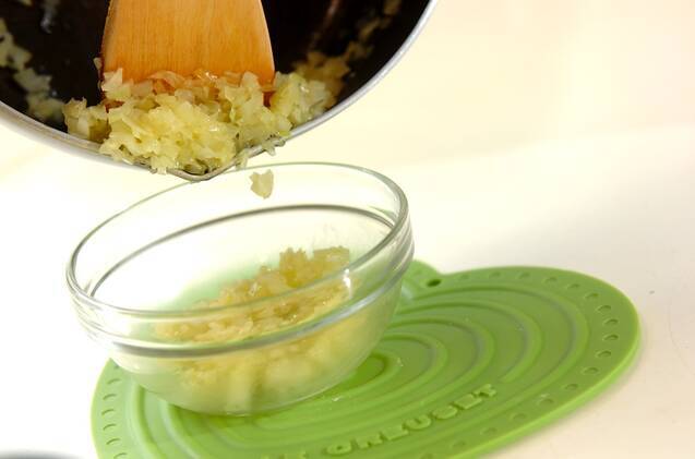 フライパンに<ハンバーグ>のオリーブ油を入れ、みじん切りの玉ネギを炒めて、きつね色になったら、ボウルなどに取り出し、粗熱を取る。