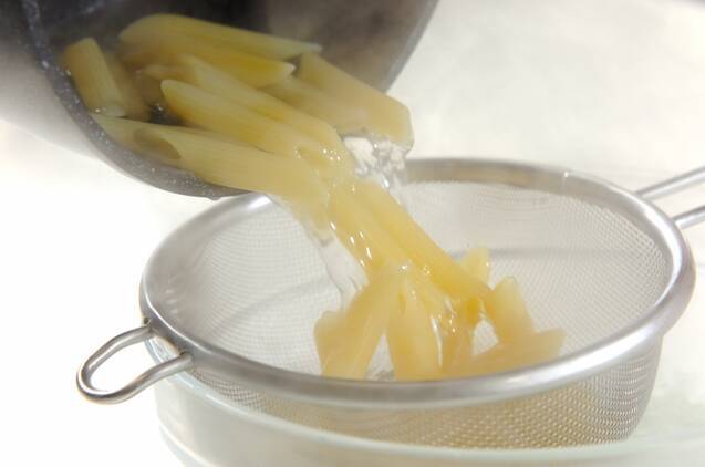 ペンネは分量外の塩を加えた熱湯でゆで、ゆで汁大さじ2程度を別に取り置いて、ザルに上げる。