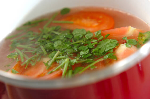 鍋に<スープ>の材料を入れて火にかけ、煮たったらトマト、クレソンを入れ、弱火で1~2分煮る。