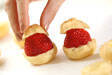 <イチゴシュー>を作る。プチシュークリームを横半分に切り、イチゴをのせ、切った上半分のシュー皮をのせる。