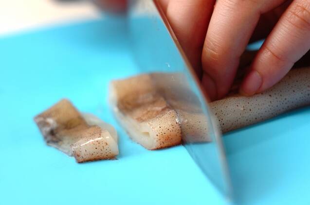 イカは胴と足がくっついている所を指で引っ張ってはずし、足を持って胴から引き抜く。胴は水洗いして軟骨を抜き取り、幅1cmの輪切りにする。