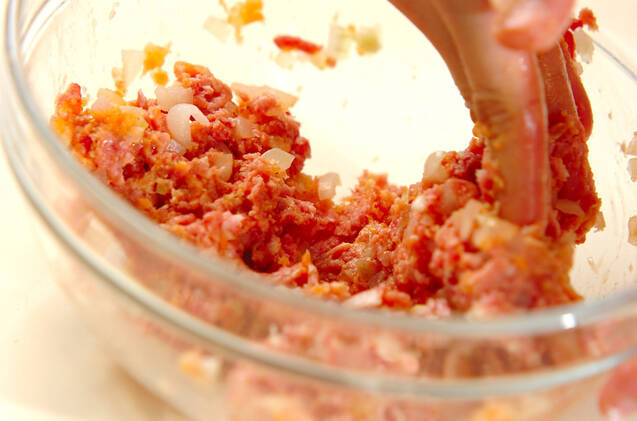 <ハンバーグ>を作る。ボウルに<ハンバーグ>の材料を入れ、よく粘りが出るまで手で混ぜ合わせる。