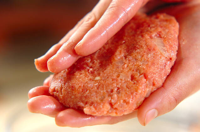 手にサラダ油をぬり、(1)を人数分に分ける。1個ずつキャッチボールをする要領で空気を抜き、俵型に形を整える。