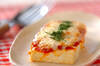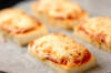 オーブンシートを敷いた天板に豆腐を並べ、ピザソースを塗ってピザ用チーズを掛け、220℃のオーブンで表面に焼き色がつくまで12~15分位焼く。