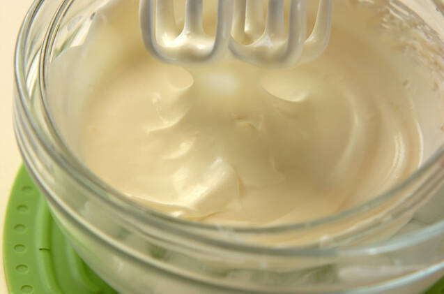 <クッキークリーム>を作る。ボウルに生クリームとグラニュー糖を入れ、氷水にあてながら7分立てにする。