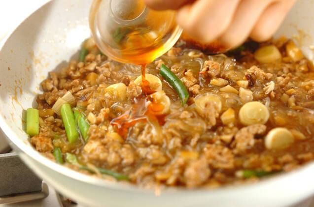 煮たってきたら、春雨を加え、<水溶き片栗>を少しずつ加えながら、お好みのトロミをつけ、ゴマ油、ラー油を加えひと混ぜする。器に盛り分け、粉山椒を振り、細ネギを散らす。(ヒント)辛みが苦手な方は、豆板醤やラー油を少なくして下さい。