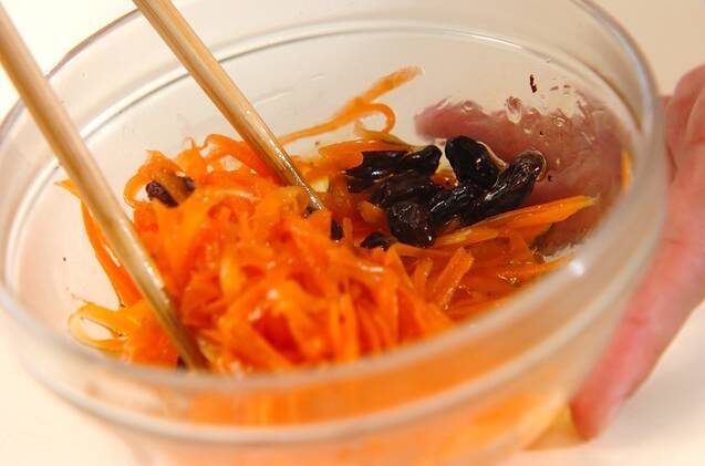 熱湯でサッとニンジンをゆでて水気を絞り、合わせた<ドレッシング>に水気をきったレーズンと共に和える。