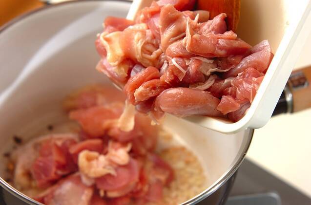 鍋にサラダ油を中火で熱し、ニンニク、ショウガを炒め、香りがたったら鶏もも肉を加える。