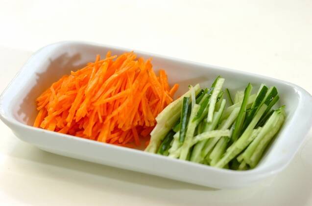 そばを袋の表示時間通りゆでる。ニンジンは皮をむき、キュウリとともにせん切りにする。