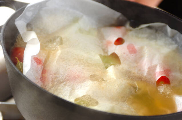 鍋に巻き終わりを下にして並べ、<スープ>の材料、プチトマトを加え、落とし蓋をして中火で煮汁が半量になるまで煮込む。塩コショウで味を調え、楊子をはずして器に盛り、ドライパセリを振る。