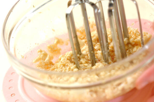 <ドレッシング>の材料を深めの容器に入れ、ハンドミキサー等で滑らかになるまでかくはんする。