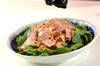 春菊は葉の部分を手で摘み取り、水洗いして水気をよくきり、食べやすい大きさに切って器に盛る。ベーコンは幅1cmに切る。<調味料>の材料を混ぜ合わせておく。