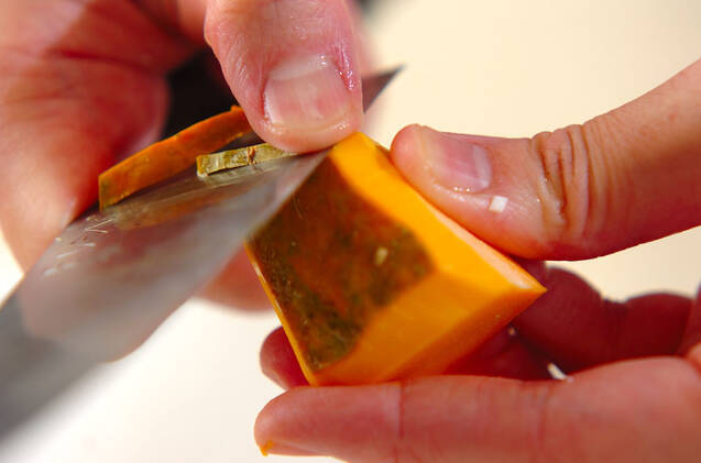 カボチャはワタと種を取り、食べやすい大きさに切って面取りをする。