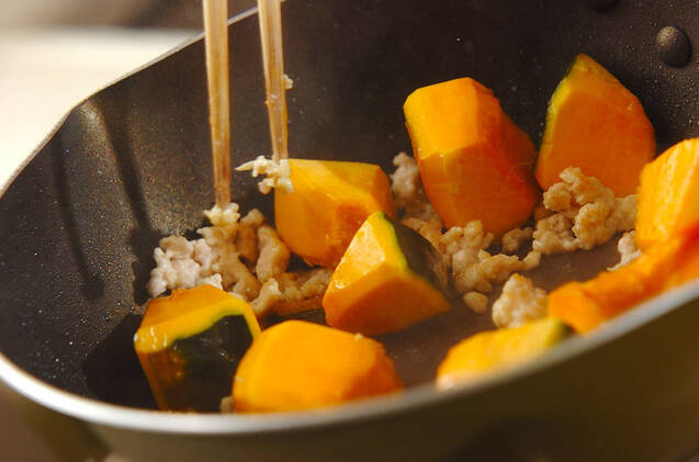 鍋にサラダ油を中火で熱し、鶏ひき肉を炒める。色が変わったらカボチャを加え、サッと炒め合わせる。