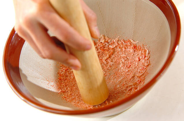 干し桜エビはフライパンに入れて、弱めの中火で香ばしい香りがするまで煎り、すり鉢で細かくする。