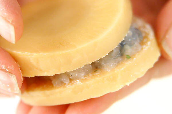 1のタケノコの汁気を拭き、2枚1組みにして、内側に薄く小麦粉を振り、2のエビをはさみ、軽く押さえる。
