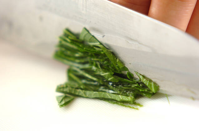 ボウルで<調味料>の材料を混ぜ合わせておく。大葉は軸を切り落とし、細切りにする。