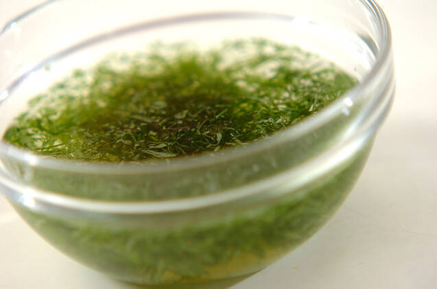 大葉は軸を切り落とし、細切りにして水に放ち、水気を絞る。