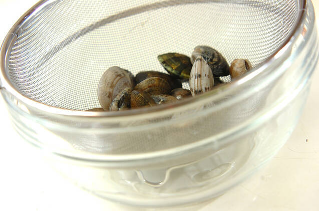 アサリは分量外の薄い塩水につけ、殻と殻をこすり合わせて洗い、ザルに上げる。