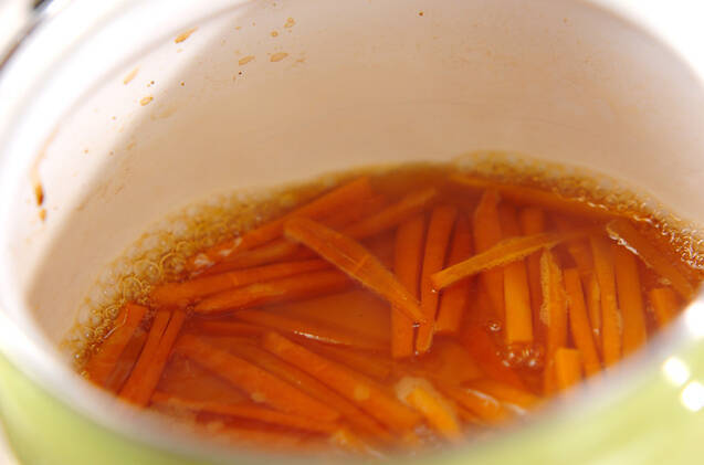 鍋に<合わせ調味料>を煮立て、ニンジンを加える。汁気が半分位になるまで中火で煮て、火を止め味を含ませる。