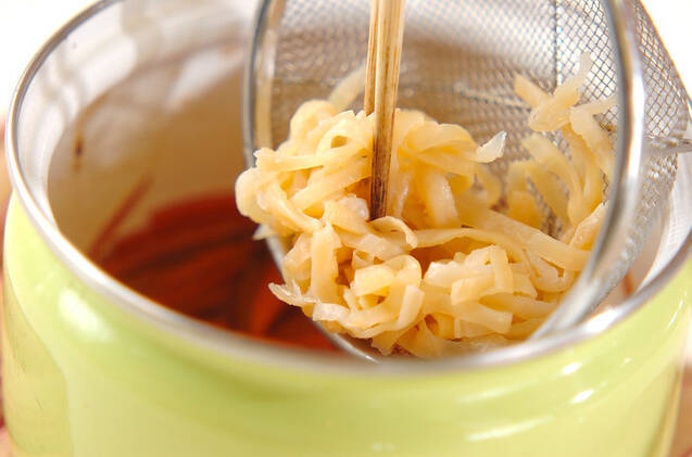(1)にクラゲとキュウリを加え、全体に和える。器に盛って白ゴマをかける。