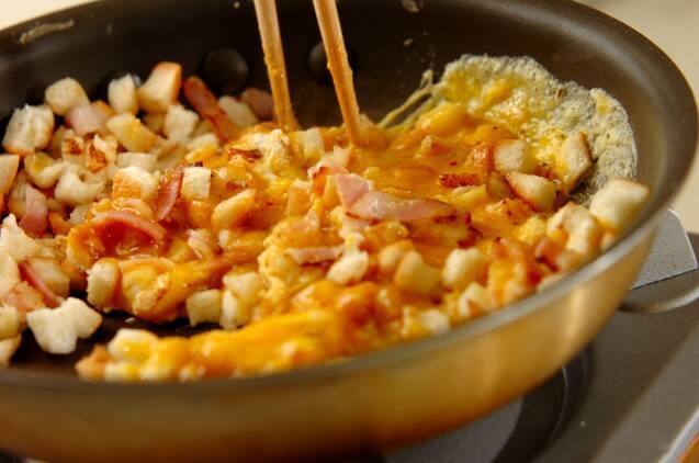 同じフライパンに残りのバターを熱し、(2)を一気に流し入れ、菜ばしで大きく混ぜる。