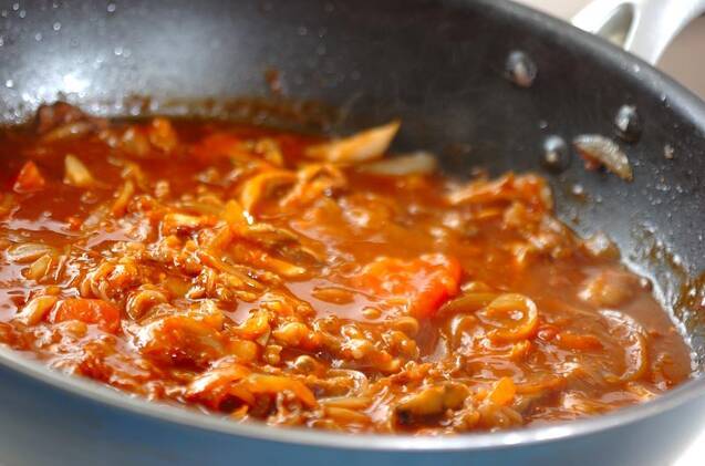 <調味料>を加え、煮立ったら火を弱めて10分位煮、塩コショウで味を調える。