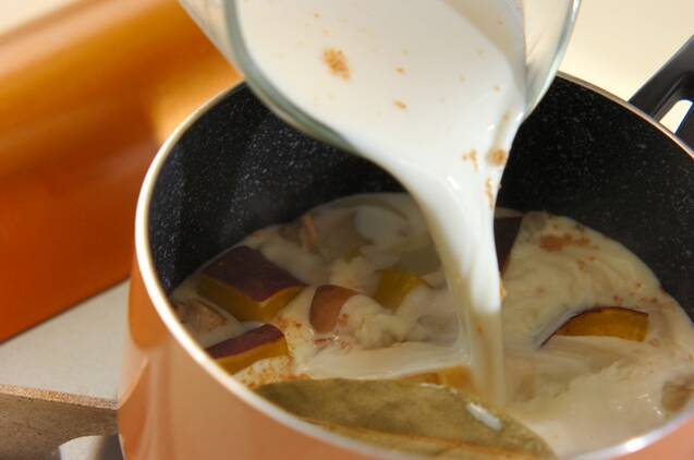 10~15分加熱してサツマイモに竹串が通ったら、<スープベース>の材料を加える。フツフツとしてきたら火を止める。
