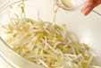 モヤシはできれば根を取り、たっぷりの水に放ってパリッとさせる。たっぷりの熱湯でサッとゆでてザルに上げる。しっかり水気をきって、作り置き甘酢をからめる。
