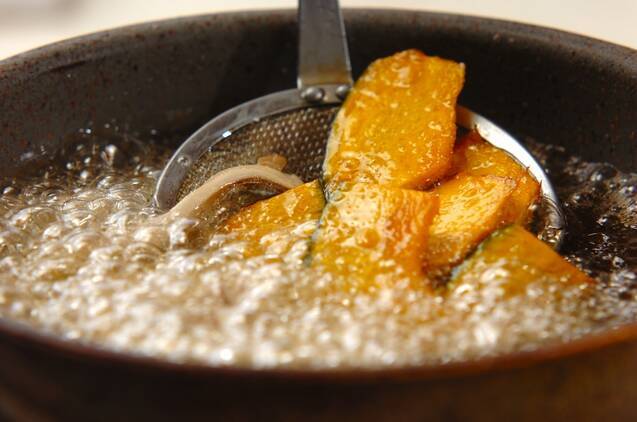 カボチャとマイタケを170℃の揚げ油で素揚げにする。