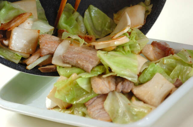 フライパンにサラダ油大さじ1/2を熱し、豚バラ肉を炒める。火が通ったらエリンギとキャベツを炒め合わせ、しんなりしたらいったん取り出す。