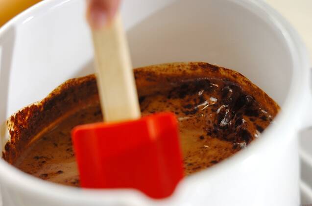 <コーヒーババロア>を作る。鍋に牛乳とインスタントコーヒーを入れて、混ぜ溶かしながら沸騰直前まで温める。