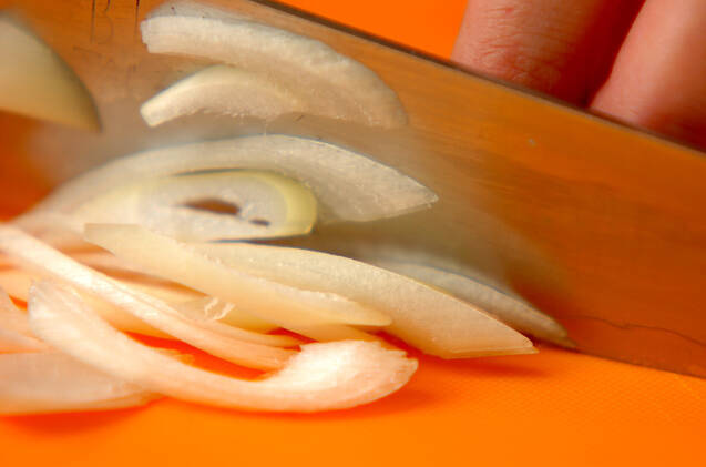 白ネギは縦半分に切って、さらに斜め切りにする。