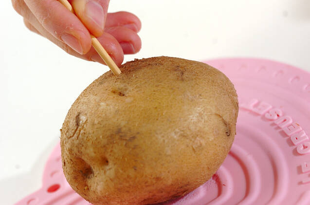 ジャガイモは皮ごときれいに水洗いし、1個ずつラップに包んで電子レンジで3~4分加熱する。竹串を刺してみてスッと刺さったらOKです。(ヒント)電子レンジは600Wを使用しています。