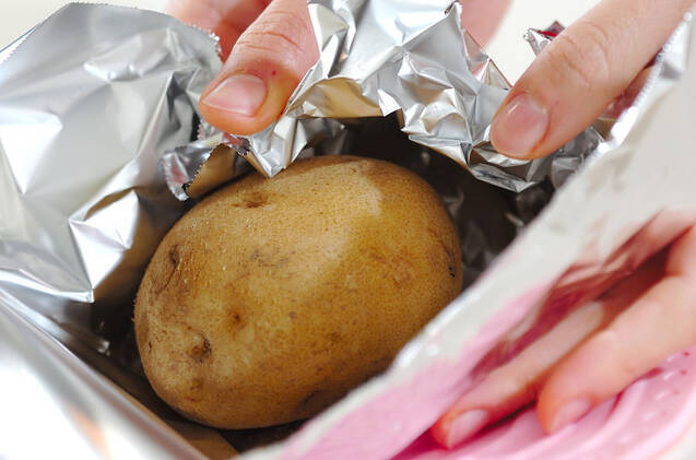 柔らかくなったジャガイモをアルミホイルで包み、250℃に予熱しておいたオーブンで10分焼く。