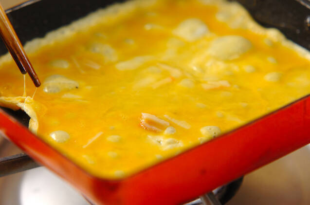 卵焼き器を中火で熱してサラダ油を薄くひき、卵液の1/3量を流し込んで全体に広げる。