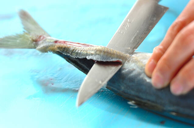 アジは尾から頭に向かってウロコを取る。盛りつけた時に裏になる側(頭を右、腹を自分側)からエラを取り、尾の付け根部分にあるかたいウロコ状のゼイゴを 尾側から頭に向かって取る。裏側の腹に4cm位の切り込みを入れてワタを出し、きれいに洗う。火が通りやすいように、表側の身の厚い部分に飾り包丁を入れる。