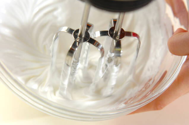残りの粉糖を2回位に分けて加え、混ぜた時にしっかり後が残るくらいまで泡立てる。(ヒント)ハンドミキサーを使って泡立てると簡単ですね。泡立て上がりはハンドミキサーから泡立て器に持ち替えて、伝わってくる感触で判断して下さいね!
