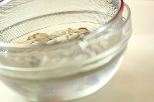 カキは分量外の塩少々でやさしくもみ、ザルに入れて水を入れたボウルに重ねて振り洗いし、水気をきる。ジャガイモ、玉ネギは皮をむいて薄切りにする。