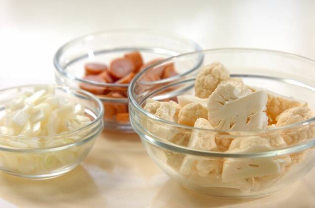 カリフラワーは小さめの小房に分ける。玉ネギは1cm角に切る。ソーセージは幅5mmの輪切りにする。