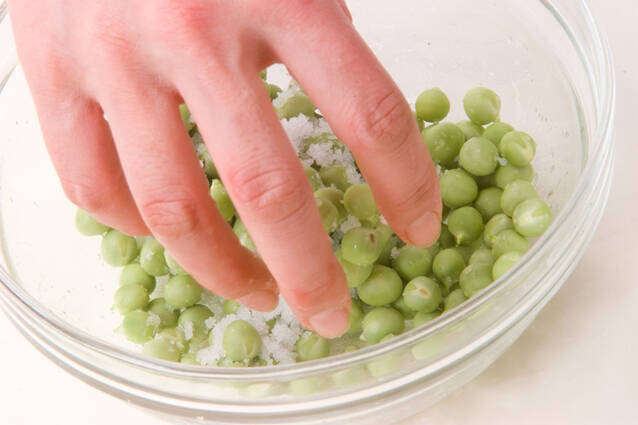 エンドウ豆はさやから出し、塩をまぶしつける。