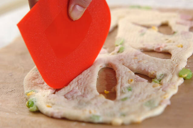 成形する。とじ目を下にして、15×30cmの楕円形にのばす。カードを使って、リーフになるように切り込みを入れる。