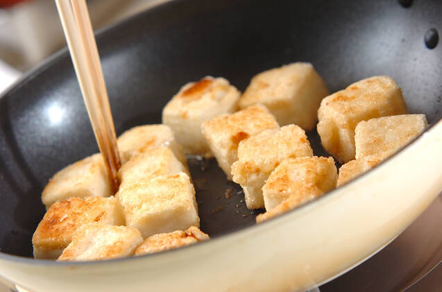 フライパンにサラダ油とバターを入れ、豆腐の表面に全体的に焼き色がつくまで転がしながら焼く。