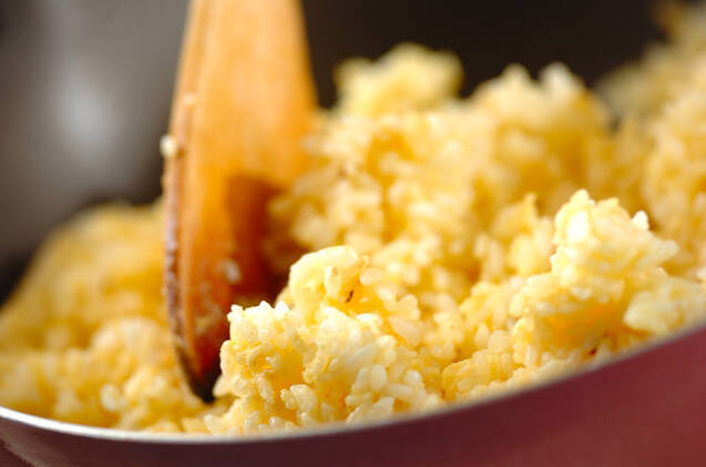 中華鍋に残りのサラダ油、ニンニクを入れて弱火にかけ、香りがたったら卵をからめたご飯を加え、強火にして木ベラで混ぜながらパラパラになるまで炒め合わせる。
