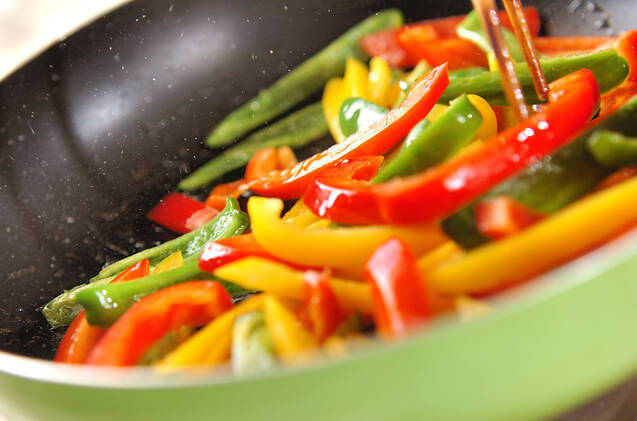 フライパンにオリーブ油を強火で熱し、赤パプリカ、黄パプリカ、ピーマンを炒めて、塩コショウをして器に盛る。