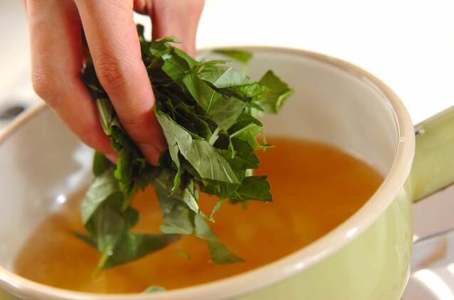 鍋にだし汁を入れて強火で熱し、煮たったら<調味料>の材料を加える。再び煮たったらモロヘイヤ、シメジを加える。