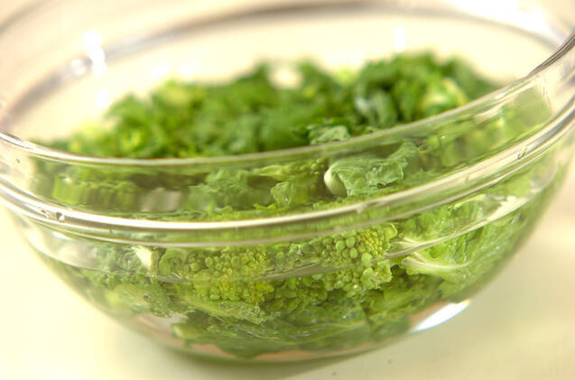 菜の花は軸の固い部分を切り落とし、たっぷりの水につけて5~6分置き、アクを抜く。