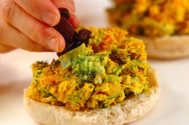 ベーグルの内側に<ハチミツバター>をぬり、<ブロッコリーとカボチャのサラダ>、レーズンをのせてサンドする。