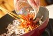 豚バラ肉、白菜キムチは1cm幅に切る。ゴマ油で豚肉が白っぽくなるまで炒め、白菜キムチ、調味料を加え、汁気がなくなるまで炒めて冷ましておく。