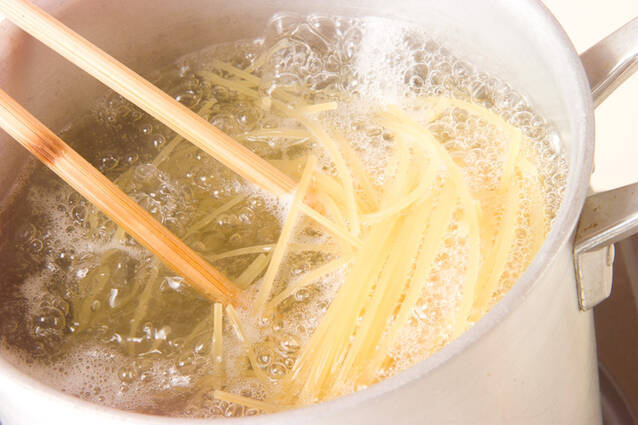 塩を入れたたっぷりの熱湯にスパゲティを入れ、麺どうしがくっつかないように時々菜ばしで混ぜながら、常に煮立っている状態で指定時間より1分短かめにゆで、ザルに上げてしっかり汁気をきる。